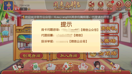 地方分区+微信绑定。闲徕旗下的(de)游戏品种以(yǐ)麻(má)将为主,一(yī)张房卡(kǎ)官方价6元,每张可玩8局。每个覆盖省份(fèn)都有一个专门的(de)手机APP,例如闲来湖南麻(má)将、闲来甘肃(sù)麻将等,且(qiě)只能绑定微信登录,不能独立注册,利用了微信的高普及度和强(qiáng)社交功能。客(kè)服均(jun1)为微信号,通过微(wēi)信与玩(wán)家交流及(jí)发展推广员,通过(guò)朋友圈(quān)营(yíng)销(xiāo)。