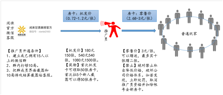 广招微信推广员加速吸引新玩家。推广员(yuán)作为游(yóu)戏的中间商(shāng),一方面(miàn)拉进更多的(de)新(xīn)人玩游戏、卖出(chū)了(le)更多的(de)房(fáng)卡,还把打该(gāi)地麻将的牌友汇聚在同(tóng)一个微信群里,有人要(yào)打麻将了,就(jiù)组织一(yī)桌(zhuō),类似于线(xiàn)下棋牌室的经(jīng)营者。