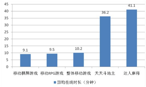 移(yí)动棋牌游戏用(yòng)户的日均(jun1)在线时长(zhǎng)为(wéi)9.1分钟,整体移动游戏(xì)的用户(hù)日(rì)均在线时长(zhǎng)为10.2分钟,移(yí)动RPG(角色扮演)游(yóu)戏的用户(hù)日均在线时长为9.5分钟。三类(lèi)游戏用户日均在线时长比较接近,基本在9-10分钟之间。