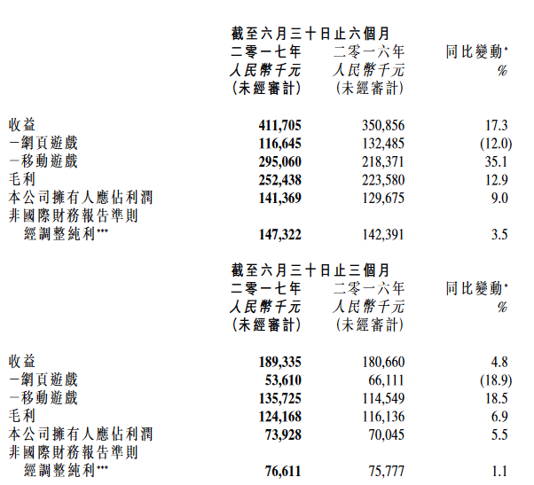 2017年8月31日,博雅(yǎ)互动发(fā)布半(bàn)年财报。截止至2017年6月30日(rì),博雅互动营(yíng)收4.12亿(yì)元人民(mín)币(单位下(xià)同),同比增17.3%。毛(máo)利为2.52亿元,同比增12.9%。公司拥(yōng)有(yǒu)人应占利润为1.41亿(yì)元(yuán),同(tóng)比增(zēng)9.0%。