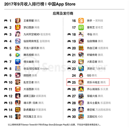 而本次Sensor Tower发布的报(bào)告中,同样也(yě)发布了(le)中国地区的APP收(shōu)入排(pái)行榜,入围前30的APP中,棋牌游戏只有一款——《腾讯欢乐斗地主》