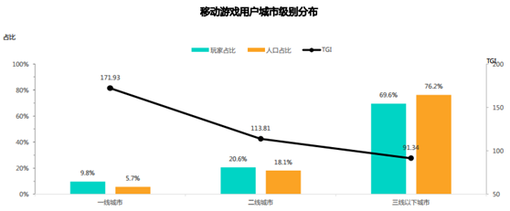 随着4G网络和智能手机(jī)的普及,三(sān)线(xiàn)以下城(chéng)市的移动游戏用户(hù)占比(bǐ)大幅提高,但是玩家集中度并(bìng)未饱(bǎo)和(hé)(TGI<100)。而随着国产低价智能手机在低(dī)线城市的不(bú)断扩张,4G网络的普及,可以(yǐ)推测移动游(yóu)戏未(wèi)来(lái)在三线及以(yǐ)下的城(chéng)市未(wèi)来发展空间巨大。2017年地(dì)方棋牌已经(jīng)率先分了一杯羹了。