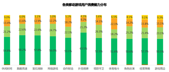 不过从(cóng)用(yòng)户消费水平来(lái)看,棋(qí)牌游(yóu)戏的玩家数据并不算出彩(cǎi),消(xiāo)费能力偏低的用户占比达(dá)63.5%,高于其他游(yóu)戏类型。这样的数据结(jié)果其实也在(zài)预料(liào)之中,一是(shì)棋牌(pái)游戏用(yòng)户(hù)中有很大一部分为休闲玩家,玩(wán)棋牌游戏以打(dǎ)发时间为主;另一(yī)方面,地方(fāng)棋牌APP中(zhōng)的“房卡”消费一般都转移到微信中去了,统计工具很难完整(zhěng)统(tǒng)计得到。