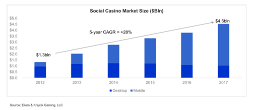 据Eilers & Krejcik Gaming的报(bào)告,未来5年,到2022年,社交(jiāo)**类游戏市(shì)场规模(mó)复合年(nián)增长(zhǎng)率为7%,从2017年的45亿美元增长到65亿(yì)美元(yuán),增长速度明显(xiǎn)放缓。