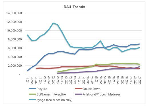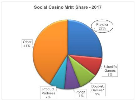 ——2017年,Top 5的公司为Playtika (27%), Scientific Games