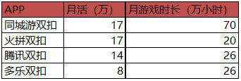 双扣(kòu)游戏主(zhǔ)要流行于(yú)我国浙(zhè)江地区。目(mù)前市面上主(zhǔ)要产品有(yǒu):《火拼双扣(kòu)》、《同城游(yóu)双扣》、《腾讯双扣》、《多乐(lè)双扣》。这四款双(shuāng)扣游(yóu)戏的月活总和大约有52万人,其中浙(zhè)江地区的(de)月活跃玩家大约为10万人。